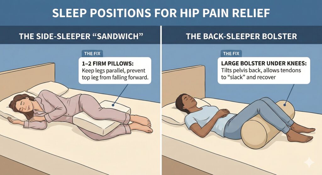 Your sleep setup is your primary recovery tool. The goal is to keep the hip in a “neutral” position.